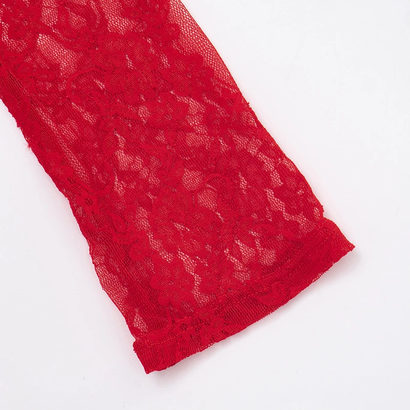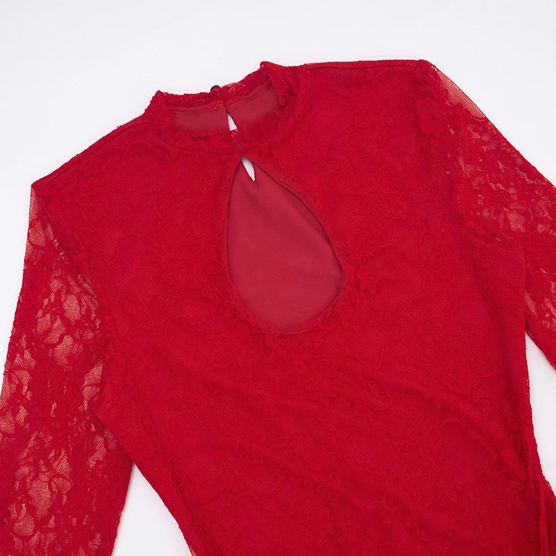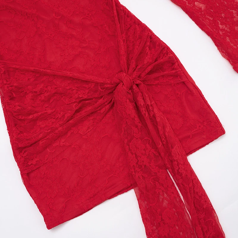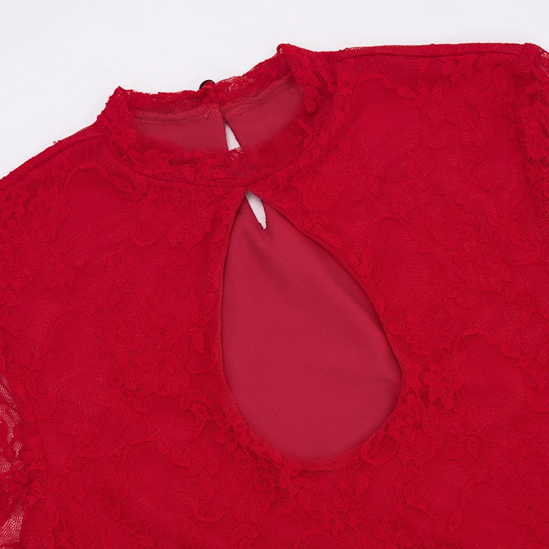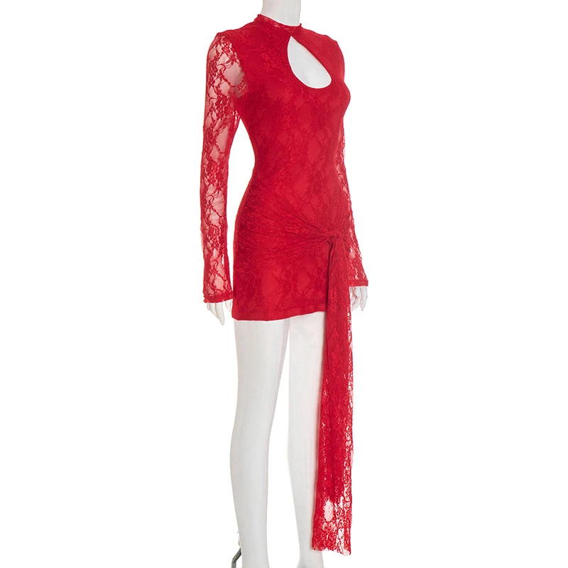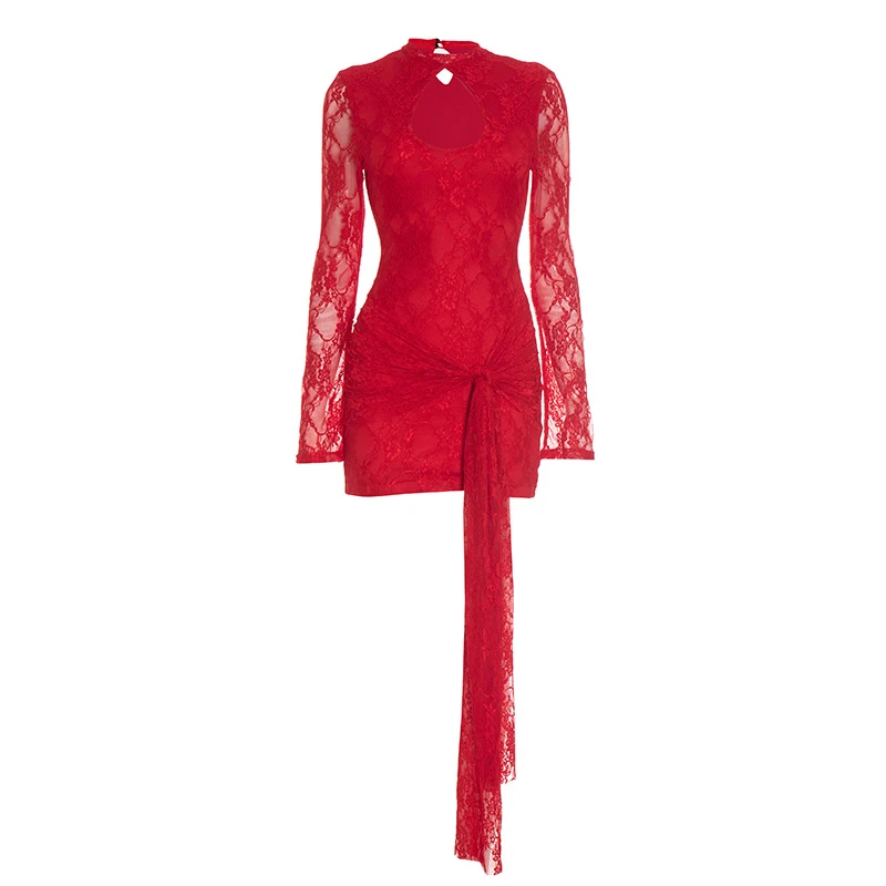 Women's Solid Color Hollow Out Strap Lace Long Sleeve Ribbon Short Dress